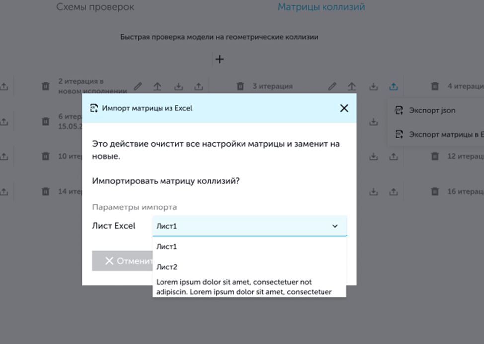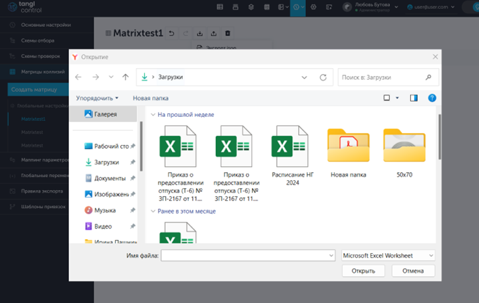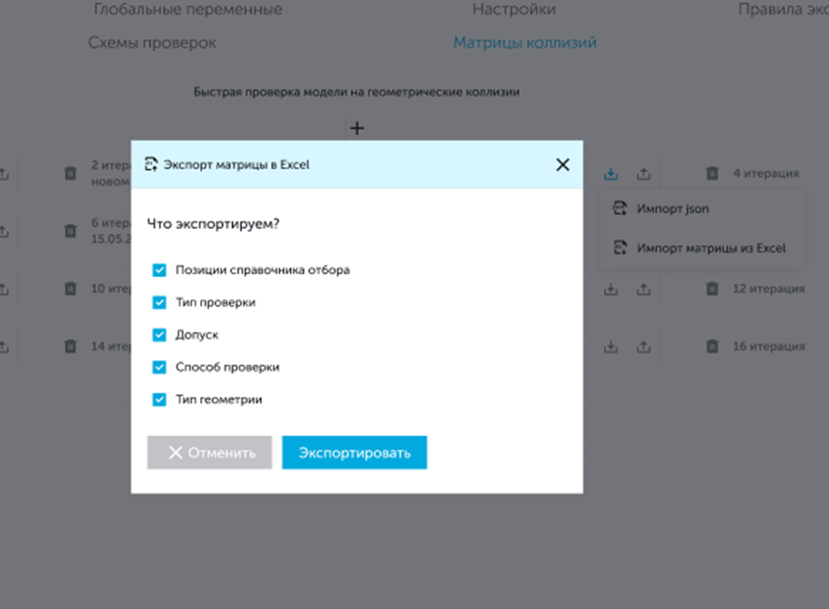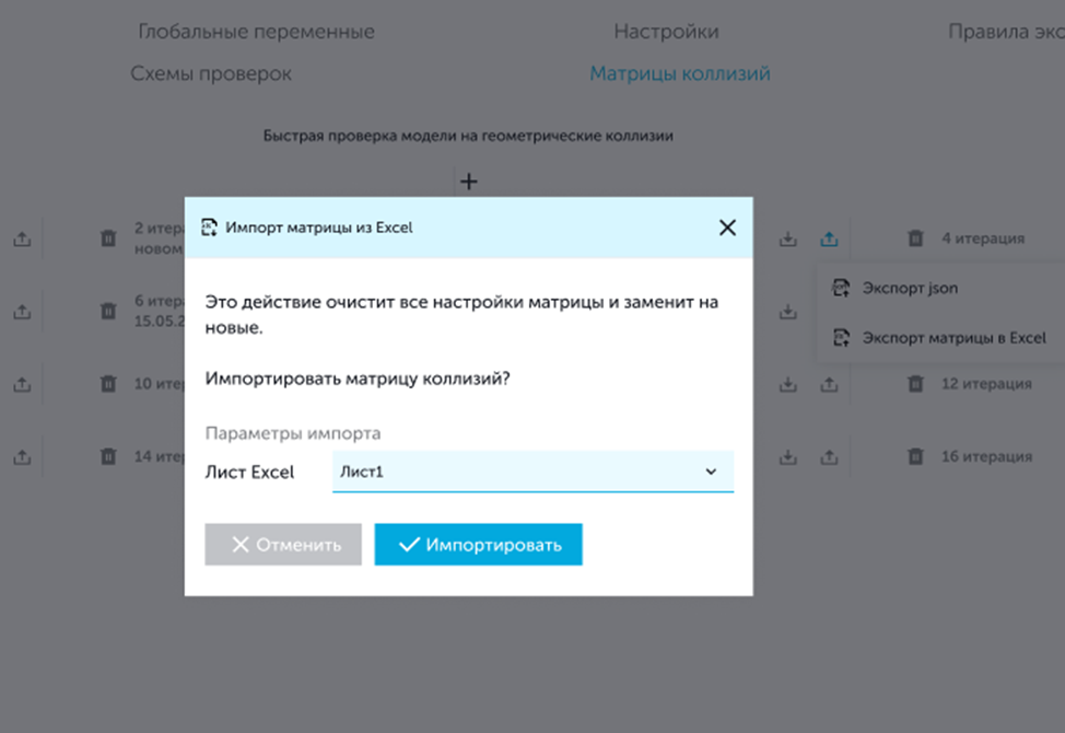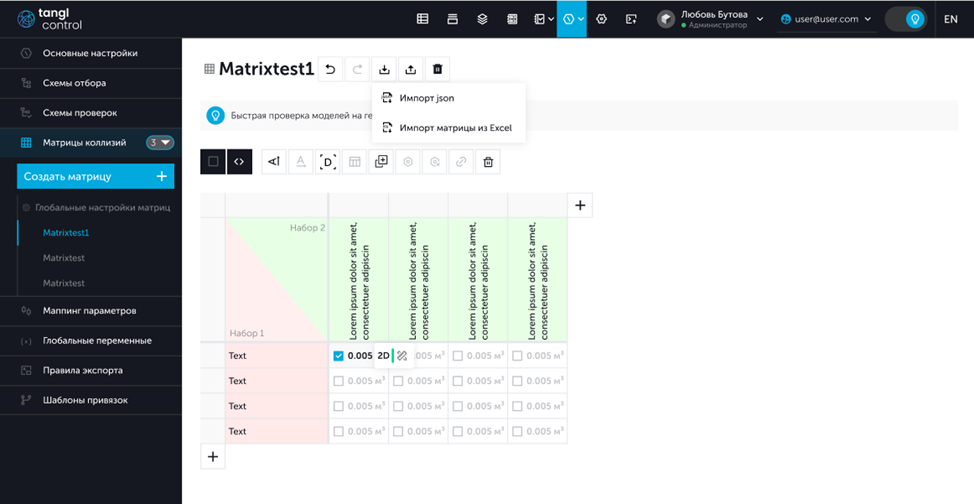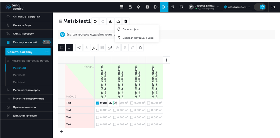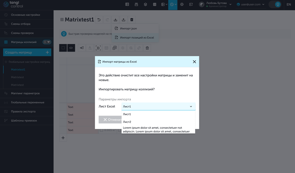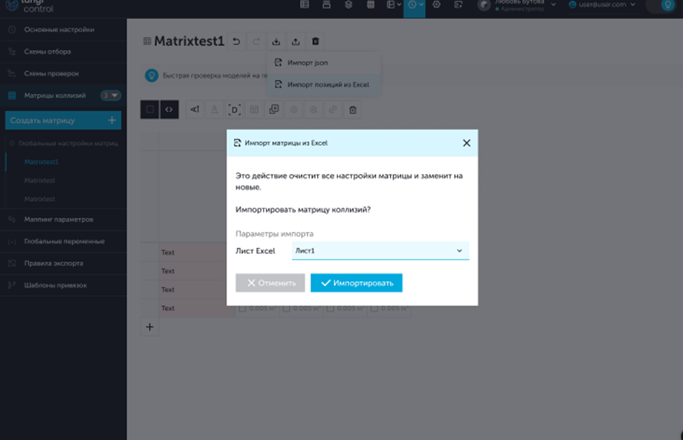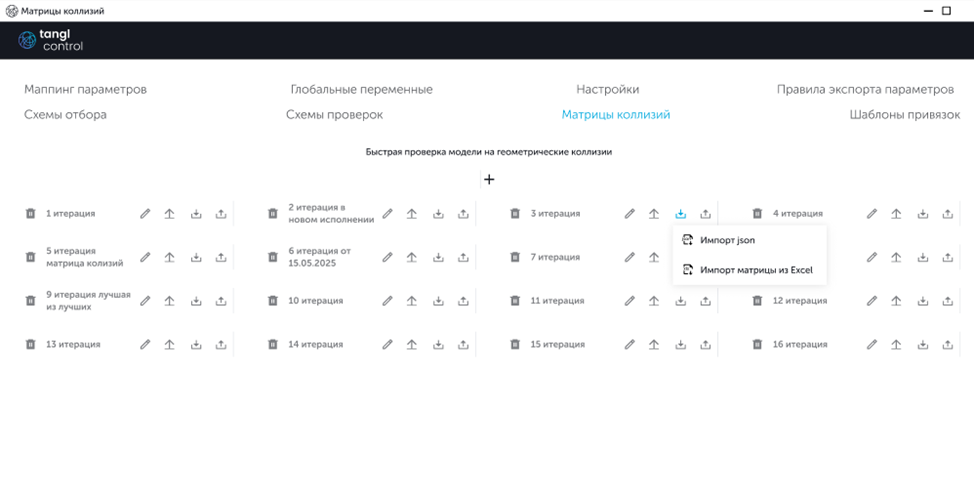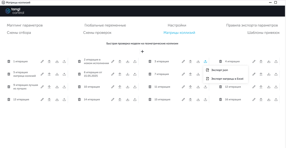 Tangl Control предлагает функционал, который позволяет пользователям производить экспорт и импорт матрицы коллизий в формат Excel. Функционал экспорта и импорта матрицы коллизий полностью доступен как в десктопной, так и в веб-версии Tangl Control.