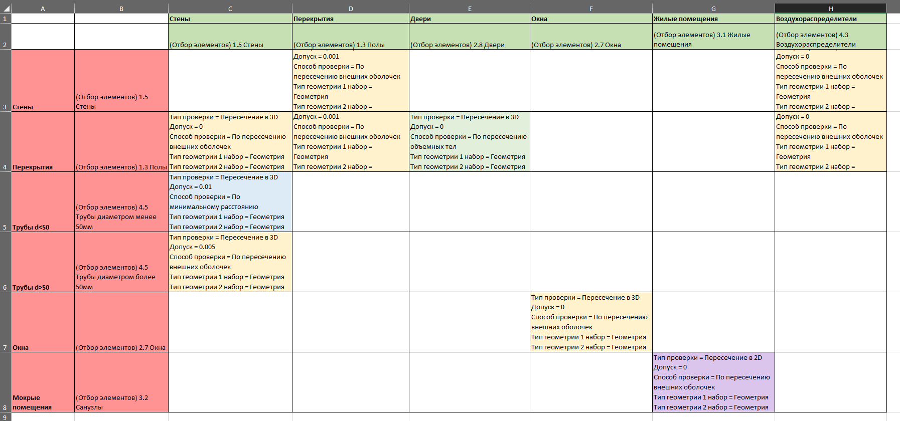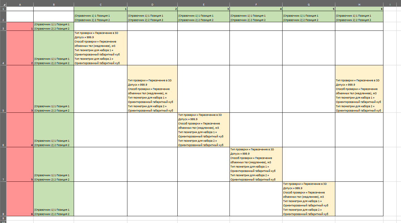 - Первый столбец и первая строка содержат наименования наборов матрицы, которые представляют собой группы элементов, подлежащих проверке на коллизии;