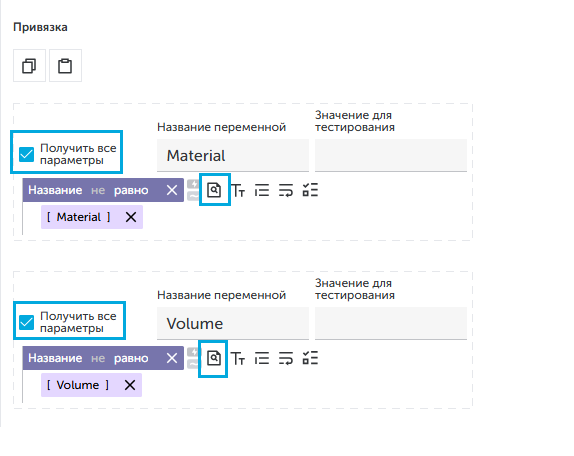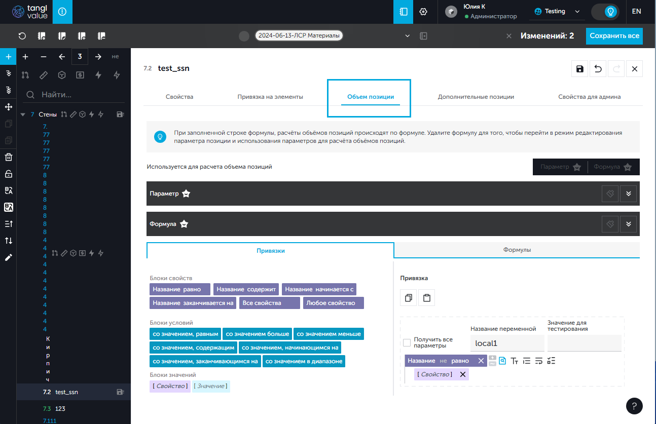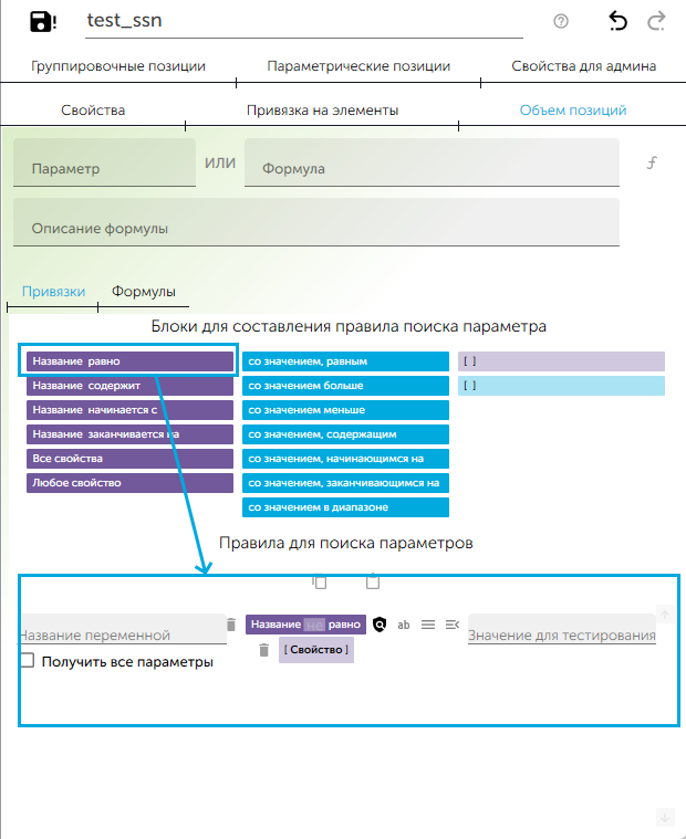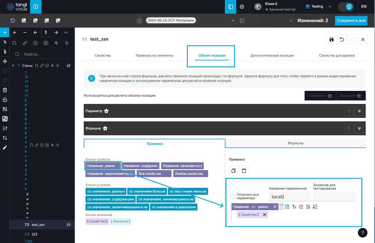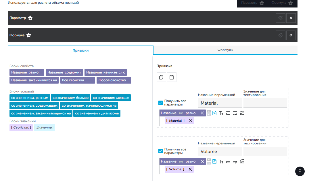 - На вкладке "Объем позиций" добавить две локальные переменные: 1. Открыть вкладку "Привязки"; 1. В веб-версии перетащить при помощи мыши блок "Название равно" из поля "Блоки свойств" в поле "Привязка".