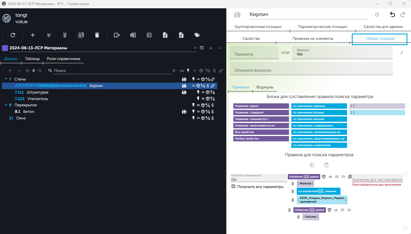 - Выбрать элемент и перейти на вкладку "Объем позиций":