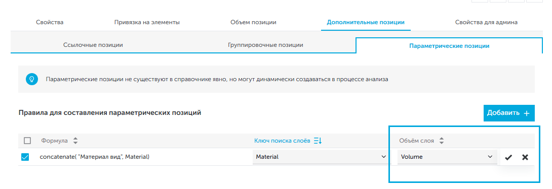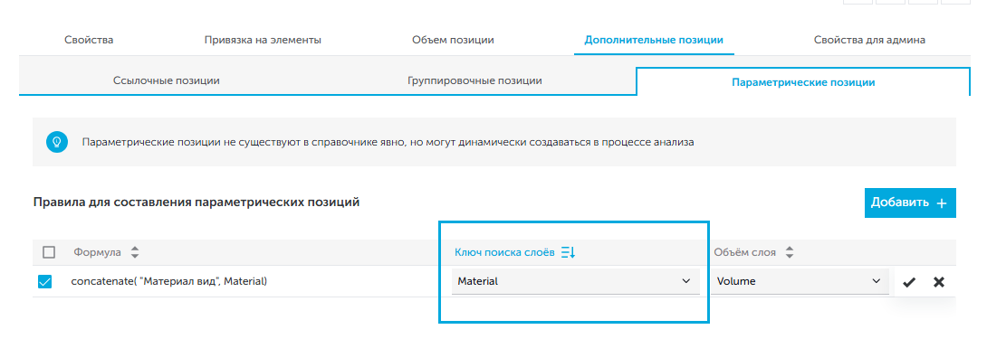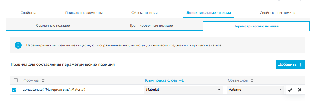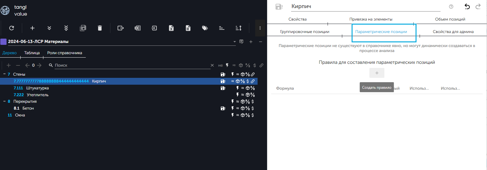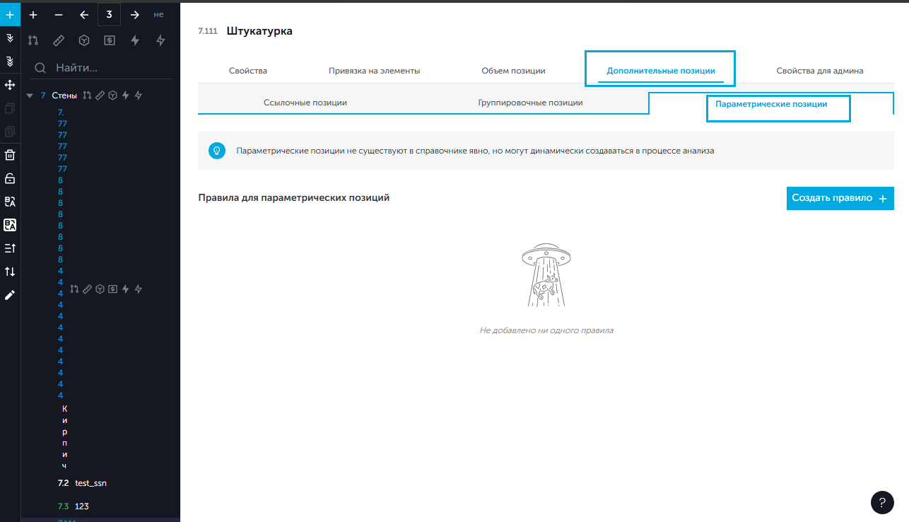 - На вкладке "Параметрические позиции" нажать на кнопку "Создать правило".