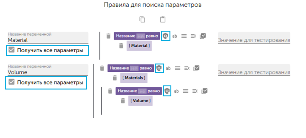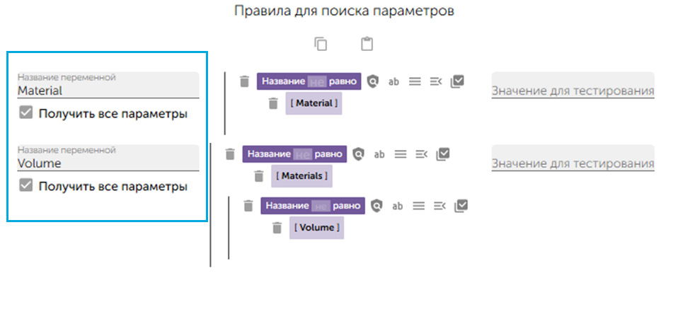 1. В приложении перетащить при помощи мыши блок **"Название равно"** из поля **"Блоки для составления правила поиска параметра"** в поле **"Правила для поиска параметров"**.