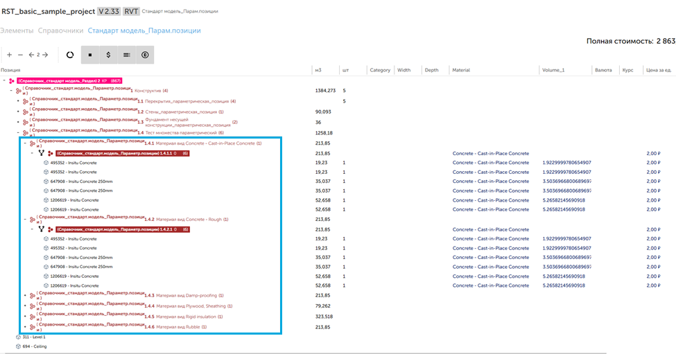 После завершения указанных этапов создаются динамические параметрические позиции, сгруппированные по значению соответствующего параметра (например, Material), как видно на примере итогового результата на рисунке ниже