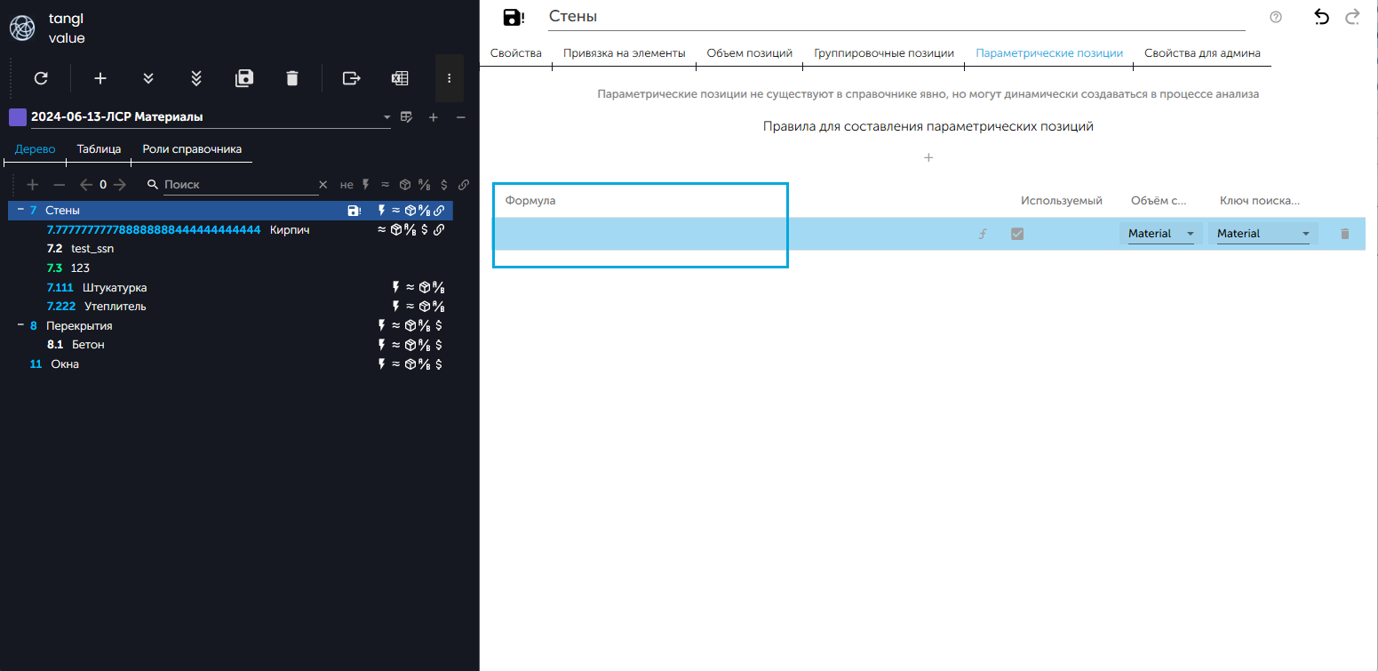 - "Формула" – значение этого параметра формирует правило, по которому будет составляться значение наименования параметрической позиции; - Параметр "Формула" в веб-версии:
