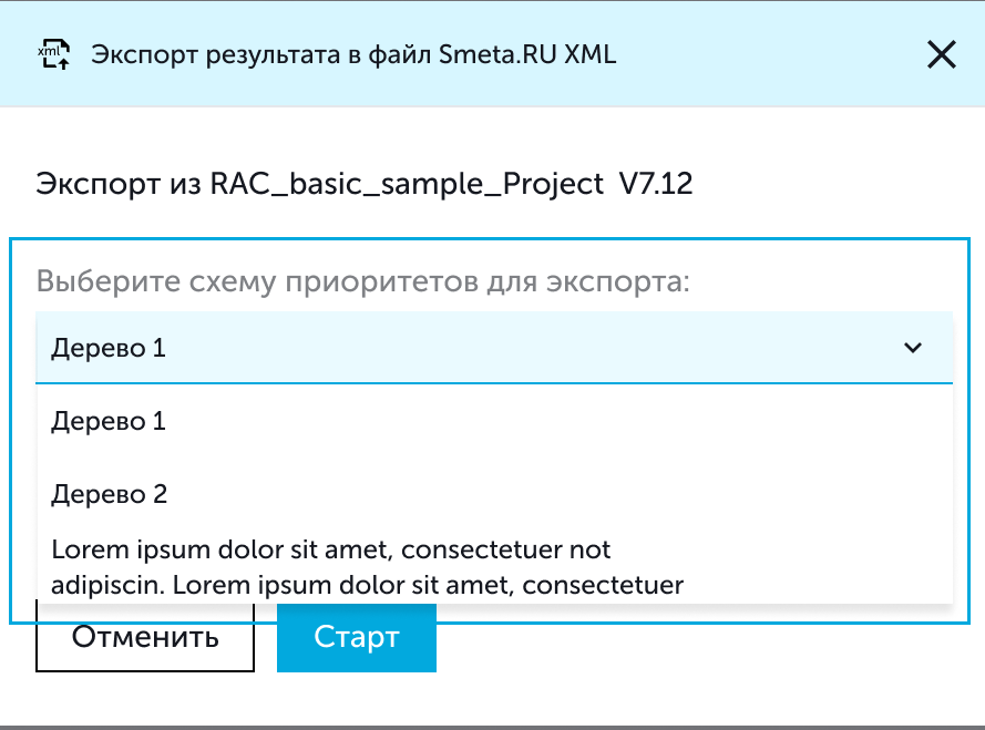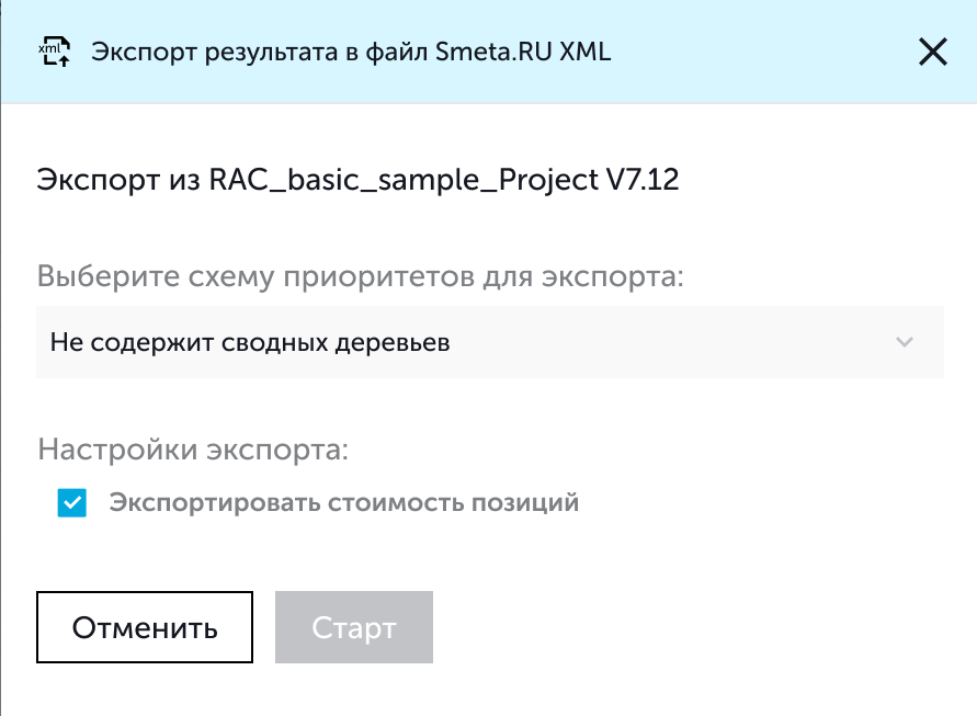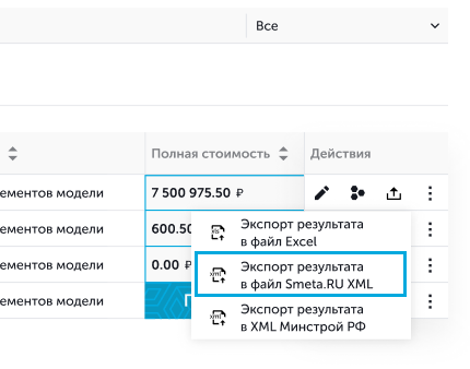 - Нажать кнопку выгрузки и выбрать пункт "Экспорт результата в файл Smeta.Ru XML".