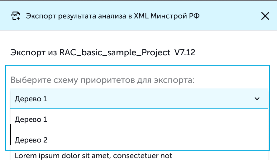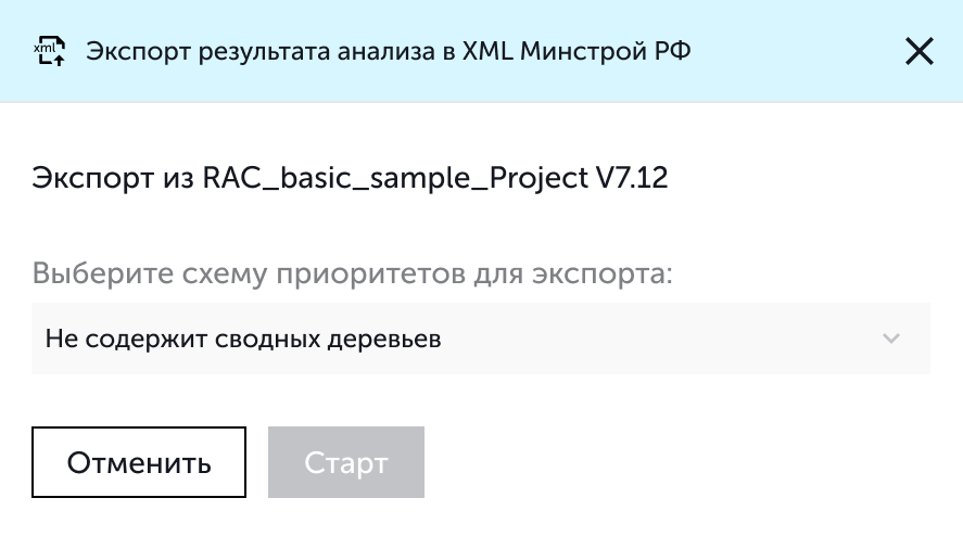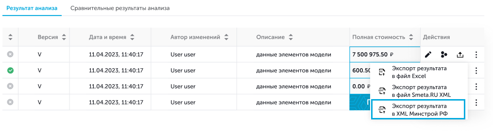 - Нажать кнопку выгрузки и выбрать пункт "Экспорт результата в файл XML Минстроя РФ".