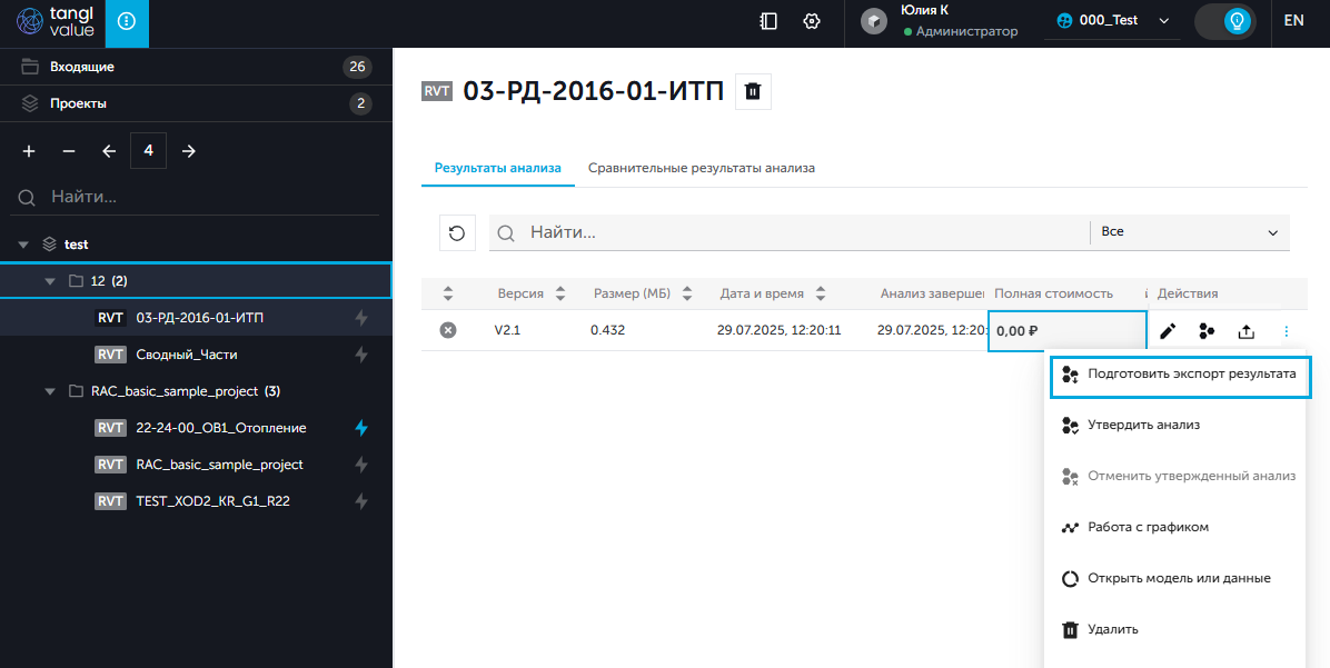 Чтобы скачать результат анализа или пересоздать результат после изменения настроек экспорта, следует выполнить следующие действия: