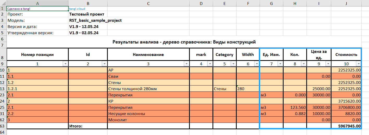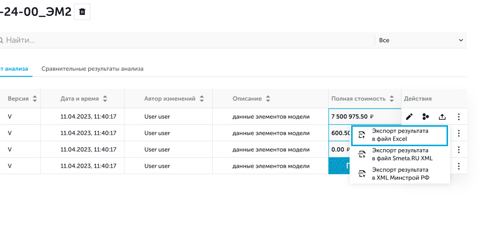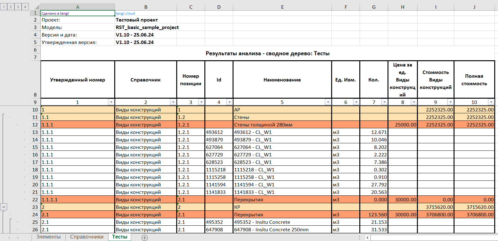 Tangl позволяет выгружать результаты анализа в формате .xml, в варианте для платформы Smeta.Ru и варианте согласно требованиями Минстроя РФ (Министерства строительства и жилищно-коммунального хозяйства Российской Федерации).