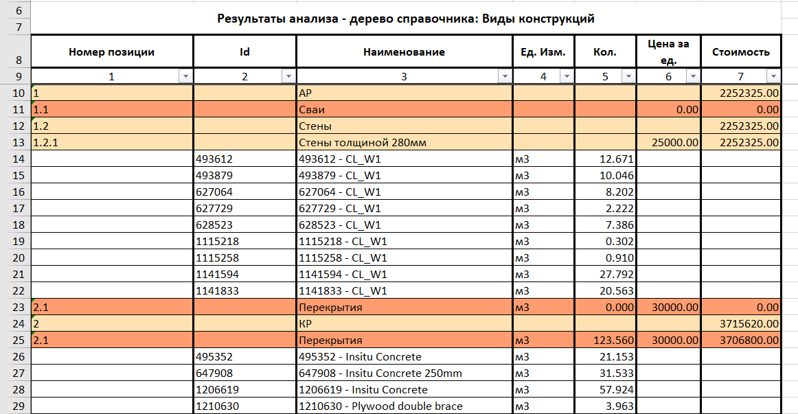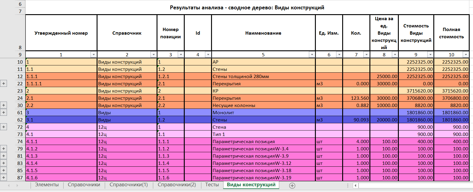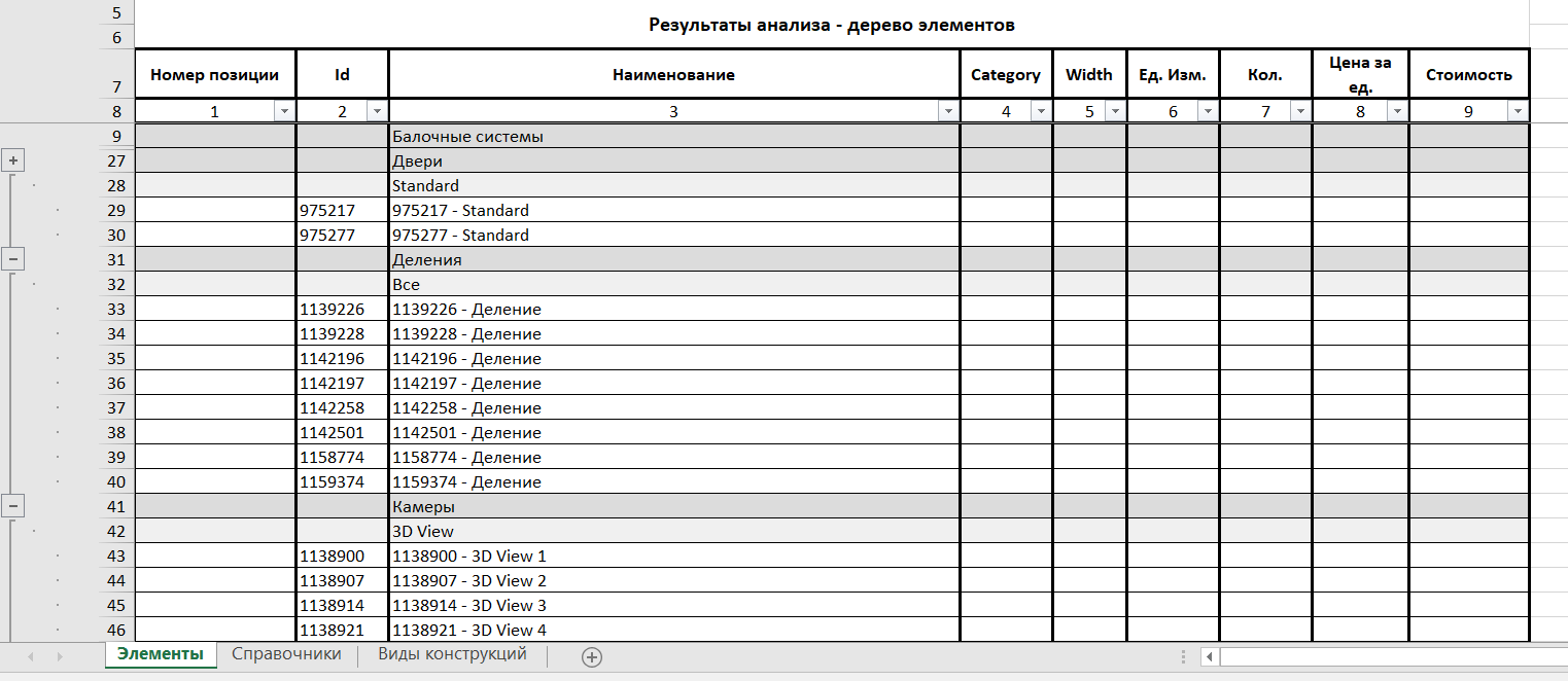 Группировка позиций в отчете Excel осуществляется по каждому уровню дерева и соответствует группировке в интерфейсе приложения Value. Все деревья в выгруженном отчете можно свернуть и развернуть аналогично интерфейсу Value.