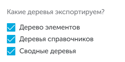 При выборе всех пунктов настроек в файл Excel будут экспортироваться все деревья: дерево элементов, деревья справочников и сводные деревья.